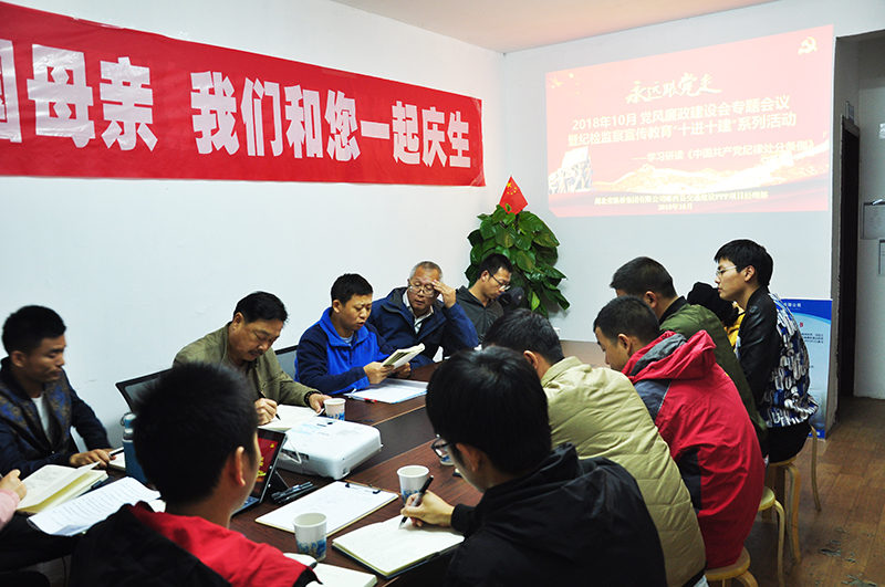 10月19日,為堅(jiān)持全面從嚴(yán)治黨,杜絕貪腐現(xiàn)象的滋生,湖北路橋鄖西PPP項(xiàng)目積極響應(yīng)集團(tuán)公司黨委的廉政號(hào)召,組織開展了2018年10月黨風(fēng)廉政建設(shè)專題會(huì)議暨紀(jì)檢監(jiān)察宣傳教育“十進(jìn)十建”系列活動(dòng)。