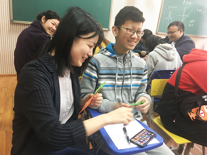 志愿者與同學(xué)們一對(duì)一結(jié)伴并通過紙筆相互交流,手把手教這些孩子們做折紙,青蛙、兔子、胡蘿卜、大象、揚(yáng)帆遠(yuǎn)航號(hào)……這些可愛的折紙作品唯妙唯俏;“你演我猜”游戲更是將歡樂的氛圍推向了高潮,在聾生們的生動(dòng)演繹和志愿者們的默契配合下,高手層出不窮,全程笑點(diǎn)不斷。