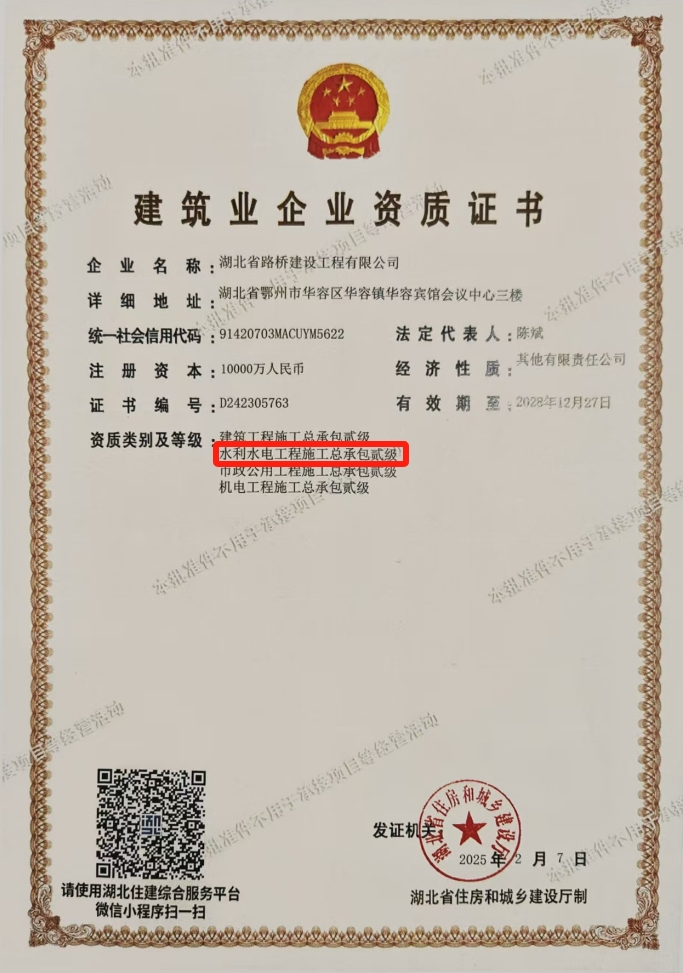近日,經(jīng)湖北省住房和城鄉(xiāng)建設(shè)廳核準(zhǔn)審批,湖北省路橋建設(shè)工程有限公司成功取得水利水電工程施工總承包貳級(jí)資質(zhì)。這一成果有效完善了公司資質(zhì)體系,不僅是對(duì)公司在水利水電建設(shè)領(lǐng)域?qū)I(yè)實(shí)力和技術(shù)水平的權(quán)威認(rèn)可,更為公司在該領(lǐng)域的市場(chǎng)準(zhǔn)入提供了堅(jiān)實(shí)的基礎(chǔ)支撐,標(biāo)志著湖北省路橋建設(shè)工程有限公司可獨(dú)立承接水利水電工程。